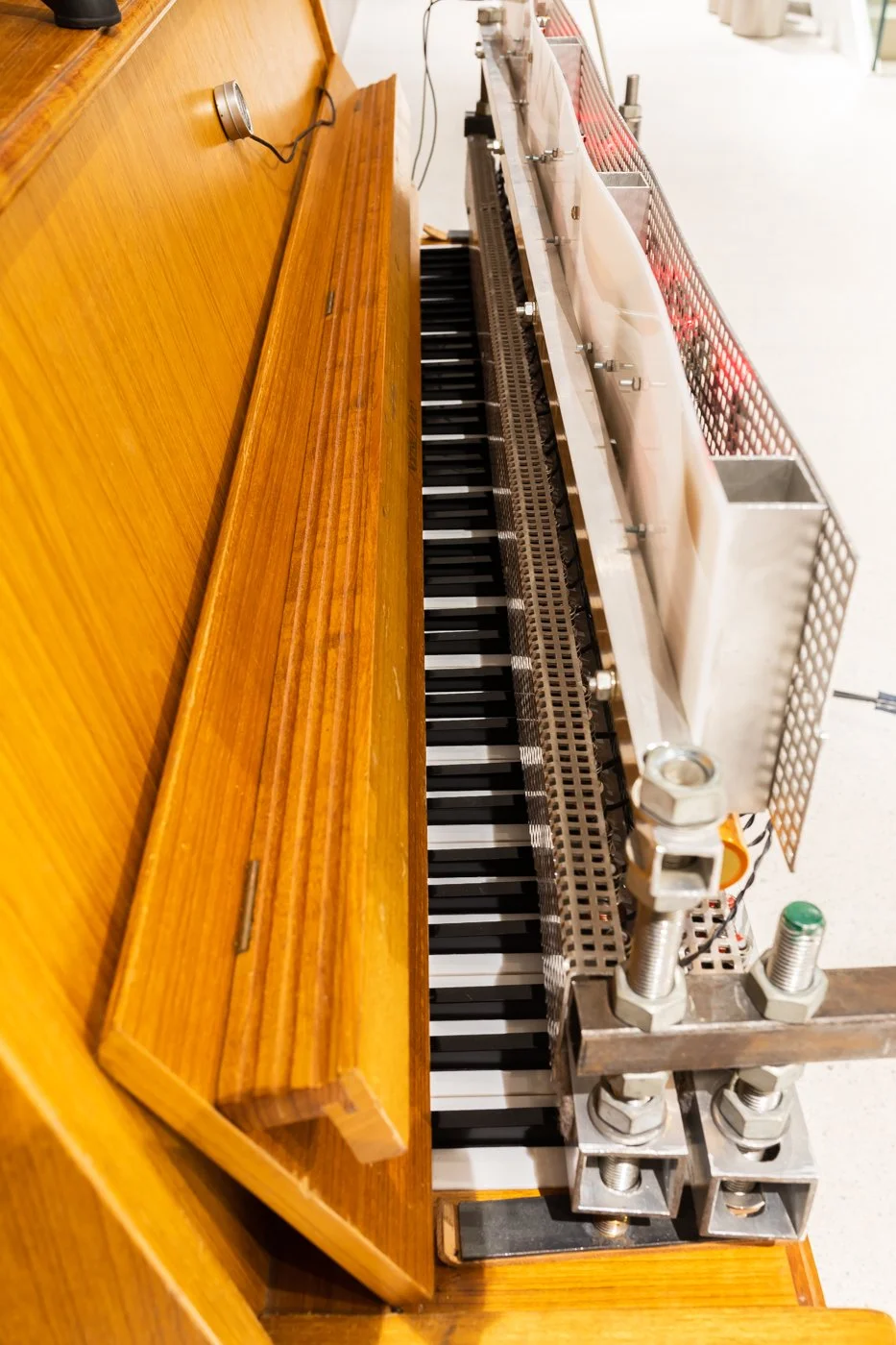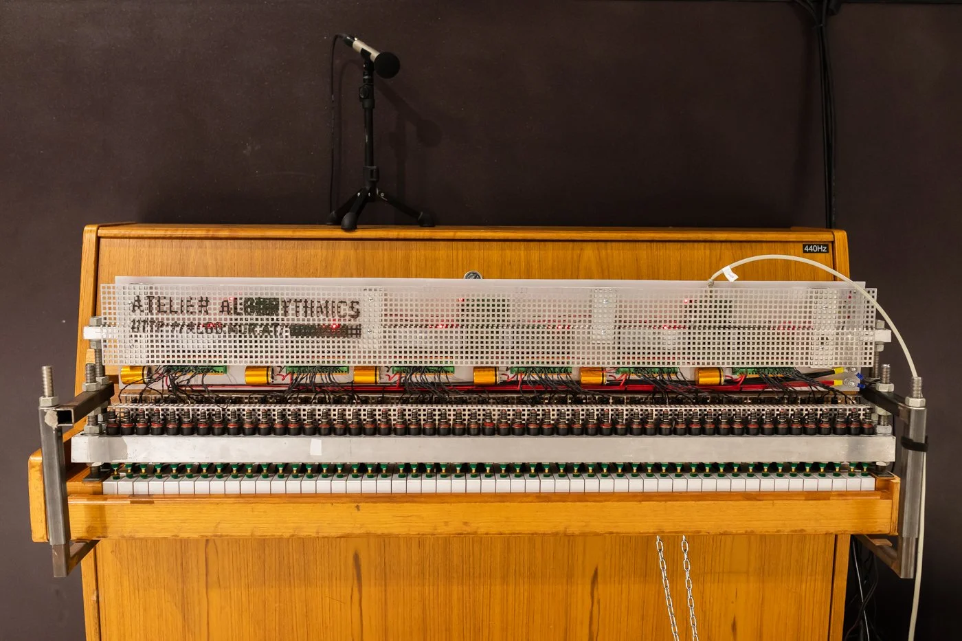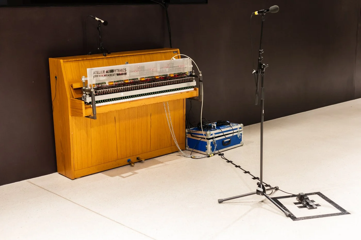 In parallel, the AI’s audio output is processed. The software extracts 16 dominant sinusoidal components per frame – brief snapshots of a few milliseconds. The resulting frequencies and amplitudes are converted into MIDI pitch and velocity and distributed across 16 channels, producing a dynamic MIDI structure that approximates the shaping of speech. These MIDI data are sent to the piano actuator developed by Winfried Ritsch and Peter Ablinger, which converts digital data into mechanical impulses. The piano actuator was central to many of Ablinger’s sound art projects and allows precise playing of rhythmically complex and maximally polyphonic structures. The result is a complex soundscape that makes speech sounds audible. Ablinger called this “understandability through reduction”: the piano “speaks” through pitch, accents, and rhythm – not semantically, but phonetically and sonically.