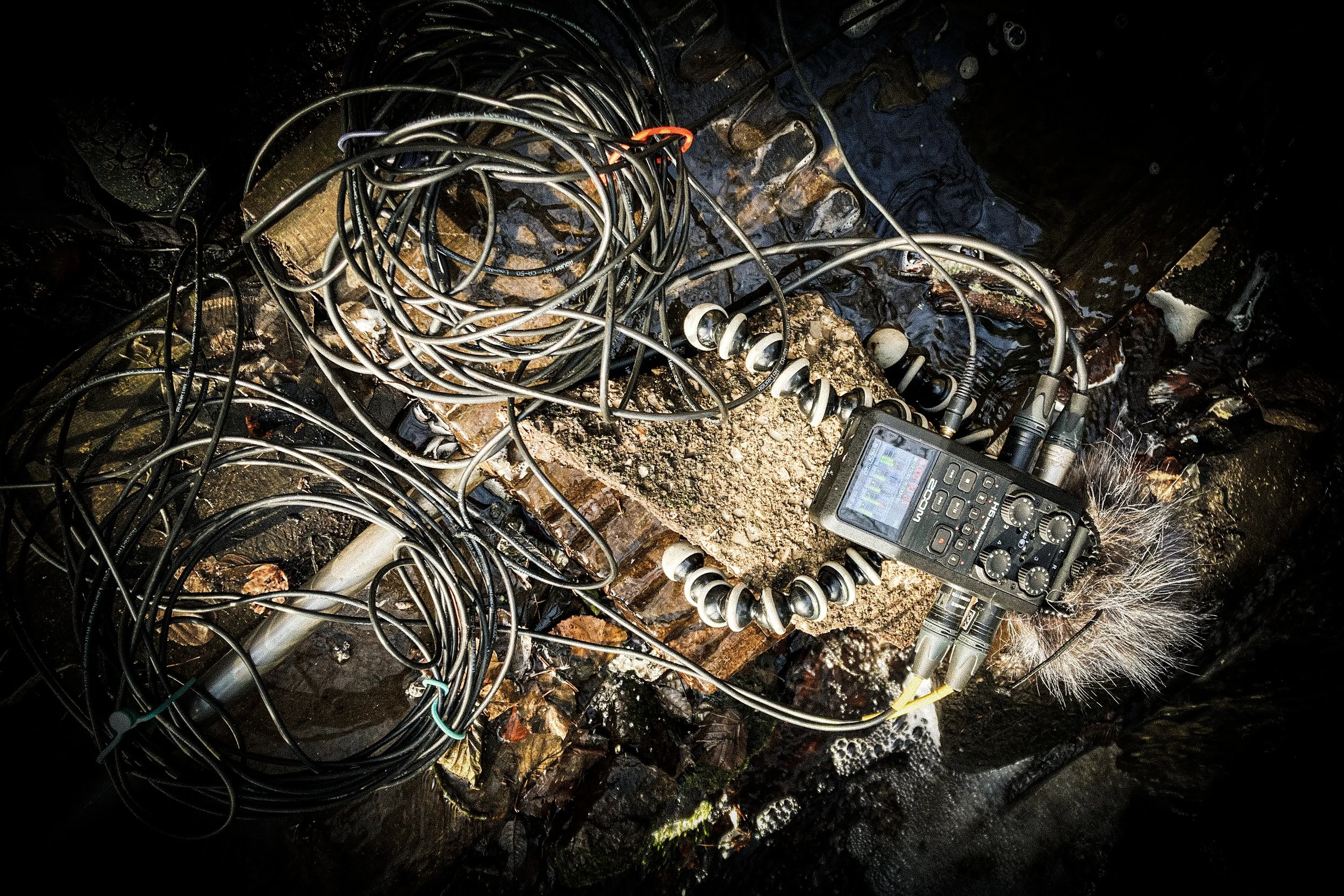 Two hydrophones were suspended in the water to capture the composition's sound from within. The recorded material was then reintroduced into the aquarium.